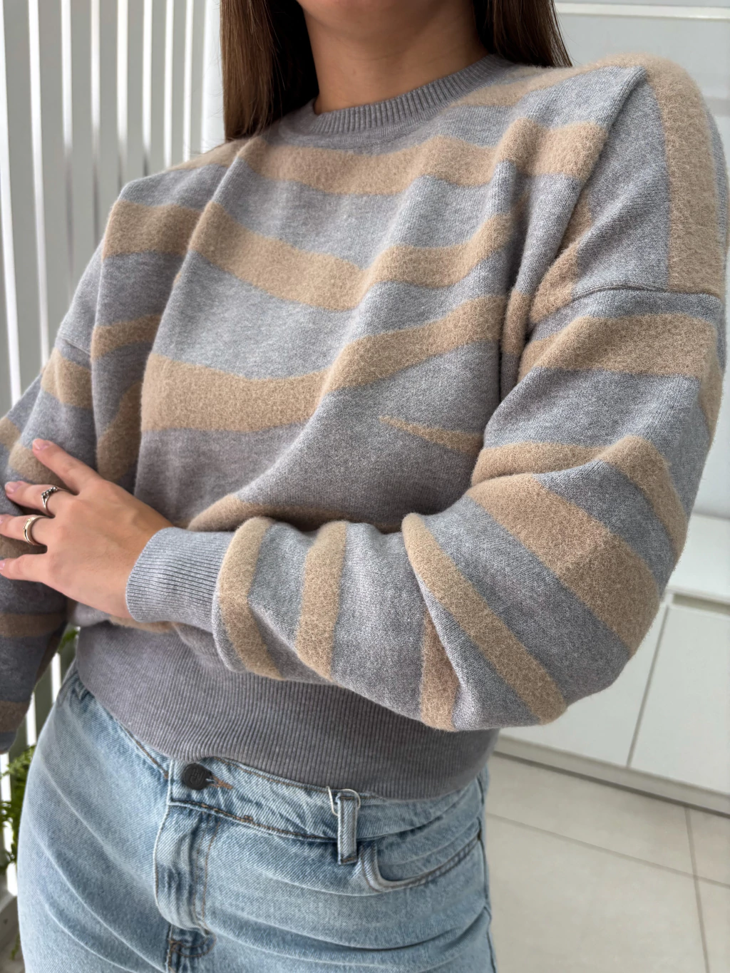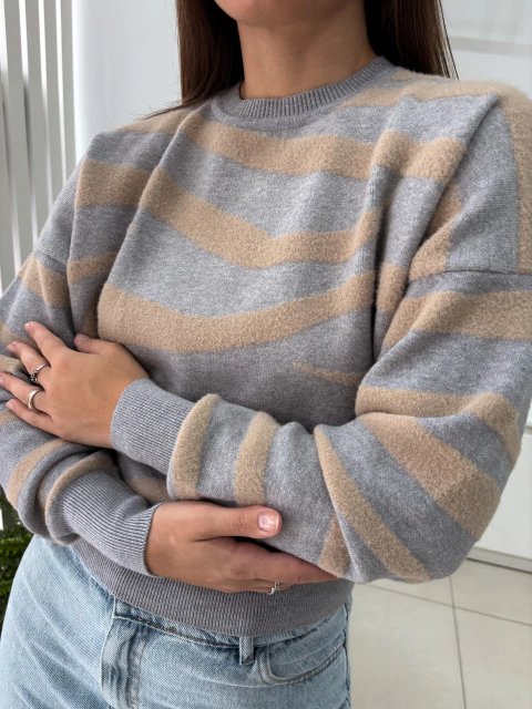 ¡Descubre el Sweater Novo! Este sweater super calentito es ideal para esos días frescos, combinando estilo y confort. Su estampado de cebra le da un toque único y moderno, mientras que el hilado de Milan+Plush garantiza una sensación suave y acogedora en tu piel.